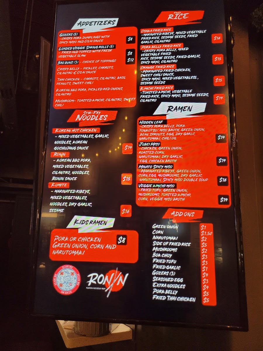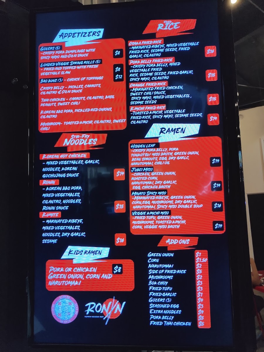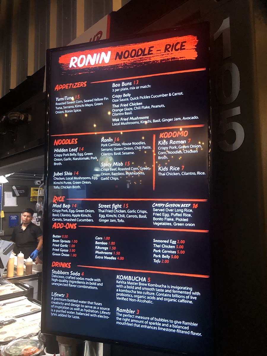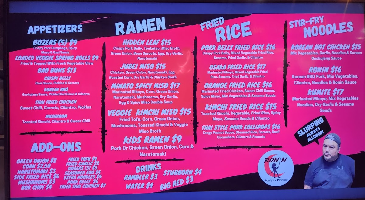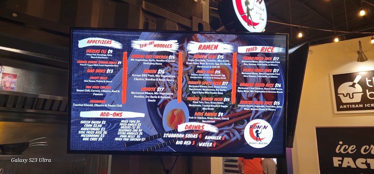 As a final takeaway, the menu at Ronin Noodle Ramen Rice Bar Mercado delivers a well-rounded and confident expression of modern Asian comfort food, blending variety with approachability. From the very start, the Appetizers set the tone: Brussel Sprouts, Loaded Veggie Spring Rolls, and Gozers (5) offer a balance of crisp textures and savory depth that works equally well for sharing or warming up the palate. The Sides-including Side Mushrooms, Side Fried Rice, and Side Fried Tofu-are simple but thoughtful additions that let diners customize their meals with ease. For heartier cravings, the Stir-Fry Noodles section stands out with options like Ronin, Kumite, Korean Hot Chicken, Coconut Red Curry Shrimp, and Akita-Tu Tofu, each showcasing bold sauces and proteins that cater to both meat lovers and vegetarians. The Bao Buns lineup-Tocino Con Huevos, Korean BBQ, Thai Fried Chicken Mushroom, and Crispy Belly-adds a playful, street-food-inspired element that’s rich, satisfying, and packed with flavor. Ramen lovers are especially well served, with choices such as Veggie Kimchi Miso, Hidden Leaf, Kids Ramen, Jubei Miso, and Black Garlic Tonkotsu, highlighting everything from lighter, plant-forward bowls to deep, umami-heavy broths. The Fried Rice selection, featuring Shrimp Fried Rice, Orange Chicken Fried Rice, Kimchi Fried Rice, Pork Belly Fried Rice, and Garlicky Egg Fried Rice, rounds out the menu with familiar yet elevated comfort staples. To wash it all down, the Drinks menu keeps things casual and refreshing with Bottle Water, Mountain Dew Soda, Big Red Soda, Dr Pepper Soda, and Pepsi Soda. Overall, Ronin’s menu feels cohesive and satisfying, making it a strong choice for anyone looking to explore flavorful noodles, ramen, and rice dishes in a relaxed setting.