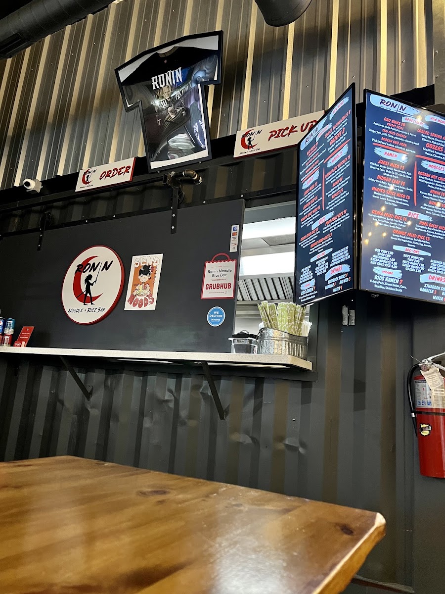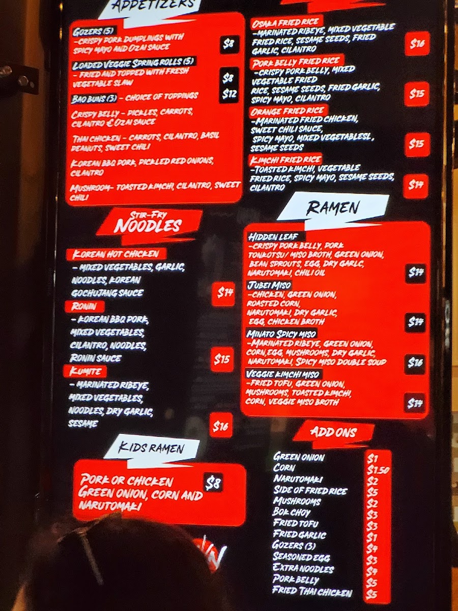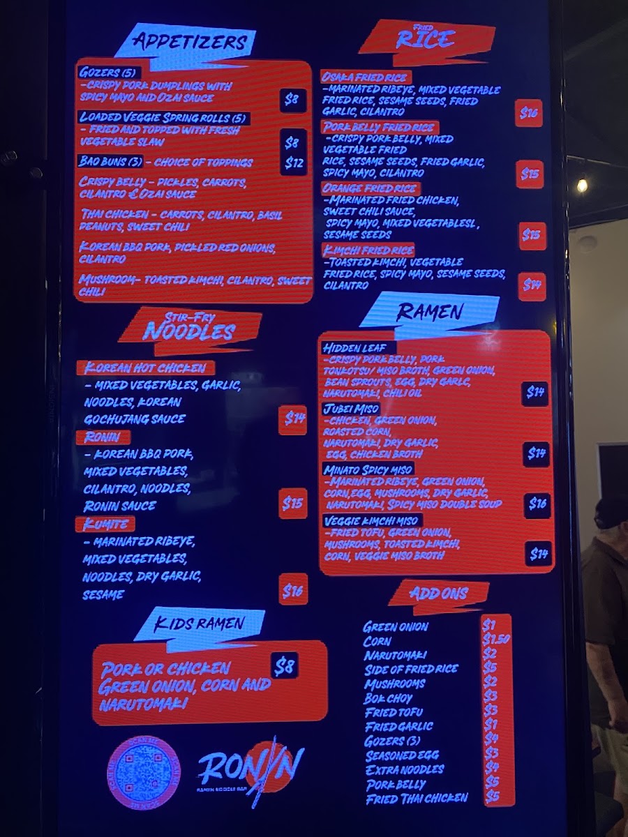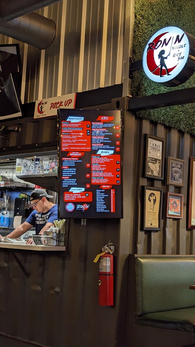 As a final takeaway, the menu at Ronin Noodle Ramen Rice Bar Mercado delivers a well-rounded and confident expression of modern Asian comfort food, blending variety with approachability. From the very start, the Appetizers set the tone: Brussel Sprouts, Loaded Veggie Spring Rolls, and Gozers (5) offer a balance of crisp textures and savory depth that works equally well for sharing or warming up the palate. The Sides-including Side Mushrooms, Side Fried Rice, and Side Fried Tofu-are simple but thoughtful additions that let diners customize their meals with ease. For heartier cravings, the Stir-Fry Noodles section stands out with options like Ronin, Kumite, Korean Hot Chicken, Coconut Red Curry Shrimp, and Akita-Tu Tofu, each showcasing bold sauces and proteins that cater to both meat lovers and vegetarians. The Bao Buns lineup-Tocino Con Huevos, Korean BBQ, Thai Fried Chicken Mushroom, and Crispy Belly-adds a playful, street-food-inspired element that’s rich, satisfying, and packed with flavor. Ramen lovers are especially well served, with choices such as Veggie Kimchi Miso, Hidden Leaf, Kids Ramen, Jubei Miso, and Black Garlic Tonkotsu, highlighting everything from lighter, plant-forward bowls to deep, umami-heavy broths. The Fried Rice selection, featuring Shrimp Fried Rice, Orange Chicken Fried Rice, Kimchi Fried Rice, Pork Belly Fried Rice, and Garlicky Egg Fried Rice, rounds out the menu with familiar yet elevated comfort staples. To wash it all down, the Drinks menu keeps things casual and refreshing with Bottle Water, Mountain Dew Soda, Big Red Soda, Dr Pepper Soda, and Pepsi Soda. Overall, Ronin’s menu feels cohesive and satisfying, making it a strong choice for anyone looking to explore flavorful noodles, ramen, and rice dishes in a relaxed setting.